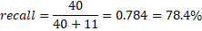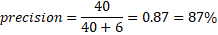 Precision measures how precise a model is when it classifies an observation as being positive. It is the ratio of true positive to predicted positive. It is also called Positive Predictive Value (PPV) and it is given by: